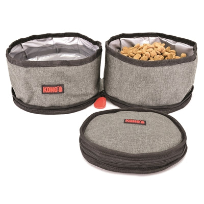 Kong Foldable Drinking Bowl/Feeding Bowl Double ist ein faltbarer Doppelfutternapf für Hunde, mit einem wasserdichten Innenraum, der platzsparend zu verstauen ist. Ein praktischer Doppelnapf, der unterwegs wenig Platz wegnimmt und dafür sorgt, dass Sie Ihren Hund jederzeit füttern und trinken können! Dieser praktische Behälter ist außen mit Stoff bespannt und wasserdicht ausgekleidet, so dass er sich leicht aufklappen und mit Wasser sowie Nass- oder Trockenfutter füllen lässt. In robustem Grau ausgeführt und mit dem bekannten Kong versehen.