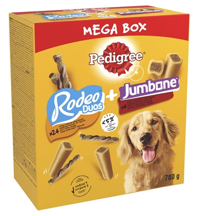 Pedigree Megabox Rodeo + Jumbone 780 gr ist ein Ergänzungsfuttermittel für Hunde. Es handelt sich um eine Snackbox, die mit einer unwiderstehlichen Kombination aus Rodeos und Jumbones gefüllt ist.