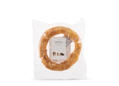 Petstyle Living Ring Puffed With Chicken 19 cm 5pcs ist ein ergänzendes Hundefutter, ein schmackhafter Hundesnack aus mit Huhn umwickelter Rohhaut. Ideal zum Kauen und gegen die Langeweile! Die Ringe sind gepufft, was sie proteinreich und fettarm macht. Sie sind mit Hühnerfleisch umwickelt, was den Ringen einen köstlichen Geschmack verleiht. Das Kauen auf Rohhaut vertreibt Langeweile und hilft, die Zähne sauber zu halten, da die Rohhaut beim Kauen an den Zähnen entlang reibt und so hilft, Plaque zu reduzieren.