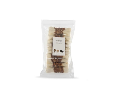 Petstyle Living Pressknochen Weiß mit Ente 7,5 cm 20 Stück ist ein Ergänzungsfuttermittel für Hunde, ein schmackhafter Hundesnack aus Rohhaut umwickelt mit Ente. Ideal zum Kauen und gegen die Langeweile! Dieser Leckerbissen besteht aus Rohhaut, die mit getrocknetem Entenfleisch umwickelt ist, wodurch der Knochen besonders schmackhaft wird. Das Kauen auf Rohhaut bekämpft Langeweile und hilft, die Zähne sauber zu halten, da die Rohhaut beim Kauen an den Zähnen entlang reibt und so hilft, Plaque zu reduzieren.