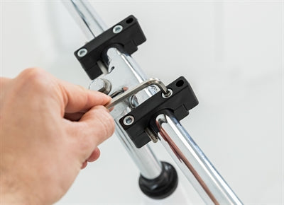 - Die Halterung klemmt sich um den Lenker, danach können Sie den Korb in die dafür vorgesehenen Löcher gleiten lassen